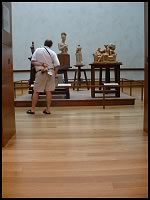 A clean, uncluttered photograph with a strong balance in the elements and colors. The central subject leaps out due to the attention-stopping yellow and dynamic grouping immediately pulls a viewer's eye to the statues. Meanwhile, the background retains enough interest to prevent the image from looking too dull and sterile. Creative use of a leftwards-looking art piece rightmost on the wall pulls you back to the main statues to enhance their significance and interest. Although there are a few minor distractions here and there, you have to realize at this point that there's simply no more that can be done since you're not allowed to move anything in this room. Overall, perhaps five to ten minutes have been spent maneuvering about the room for a great photo, and luckily, there is one! Not every scene will allow you to take a great photo but after some practice, you'll realize which scenes will offer you greater possiblities. Because you are often limited by time, you must develop a feel as for how much time you will want to spend on any scene. You will learn through practice to notice that when a scene strongly attracts your eye, there's often a good picture to be had, and a few extra minutes will probably be worth it (although your companions will have moved on by now). Thankfully, because digital cameras are limited only by their available battery power and size of storage, you should take a few more pictures than you would normally do with a 35mm camera. Extra batteries and larger storage cards would help. Take the pictures and view/print a proof sheet of them on screen. Then, compare the various photographs of the same scene and pick out ones that stand out particularly well. If you take the time to find out the differences between these and the duller photos, you will be on your way to knowing which scenes will turn out to be great photographs and when to avoid taking the duller ones. |