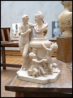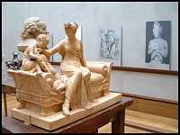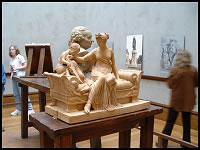 Most causal photographers would see the excellent detail of the statue, the good top to bottom fit of the foreground statue, and a bit of interesting 'location' detail created by the backwards facing statue in the rear. A quick look at their cameras in playback mode, a nod at the good colors, and off they go to the next room. But here, a discerning photographer would also see the glaring inclusion of the two gentlemen in the background sticking out like sore thumbs. The solution if you have the time is to wait until there is a moment when nobody is standing in the open (they can be standing behind the larger statue, which would hid them completely). Even so, in a busy museum, this may not be possible. Keep in mind that with digital photography, there is the opportunity later to digitally remove the people in a good photo editing program, so you should still take one shot even if the scene is not perfect. In any case, a few moments with these two statues reveal their main limitation - although there is a bit of depth created by the front and smaller rear statues, there is lack of dynaminism and excitement. One may wonder for a moment what that is and only by looking at the works of great photographers and developing your own sense of likes and dislikes will you be able to understand quickly. For the rest of us, a quick look at major magazine covers and advertisements will give you a better idea as to what works and what doesn't. You will want to look for various photographs that stand out attractively, look good even under a few more seconds of scrutiny, and retain a fresh, imaginative, exciting appearance even after a few more viewings. At the same time, look at the boring and dull photographs and try to compare them to the attractive ones. You'll often begin to see patterns of great photography and how some compositions work better than others. By doing this, you'll become attuned to what works well, sometimes so much so that you can easily recognize and take great pictures in a heartbeat. In any case, this could be a typical photograph scene in a descriptive brochure or educational flyer since it is easy to take by the curators when nobody is around, and it gives an accurate view of the major details of the foreground statue for later study.